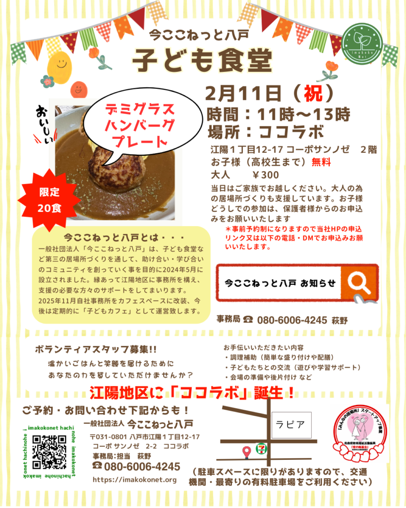 今ここねっと八戸の子ども食堂は、毎月カレーライスのバリエーションをお届けしていますが、2月は少しだけひねりを加えて、デミグラスソースハンバーグプレートをお届けします!