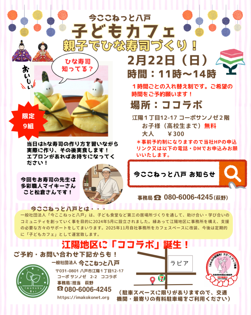 2月の子どもカフェはひなまつりに向けた「ひな寿司づくりに挑戦」を行います。