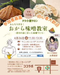 テラ小屋サロン 「みんなで作ろうおから味噌教室」のお知らせ